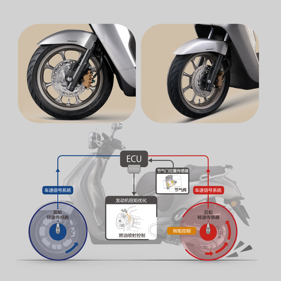 双通道 ABS + 后轮 TCS + 半热熔胎 + 胎压监测