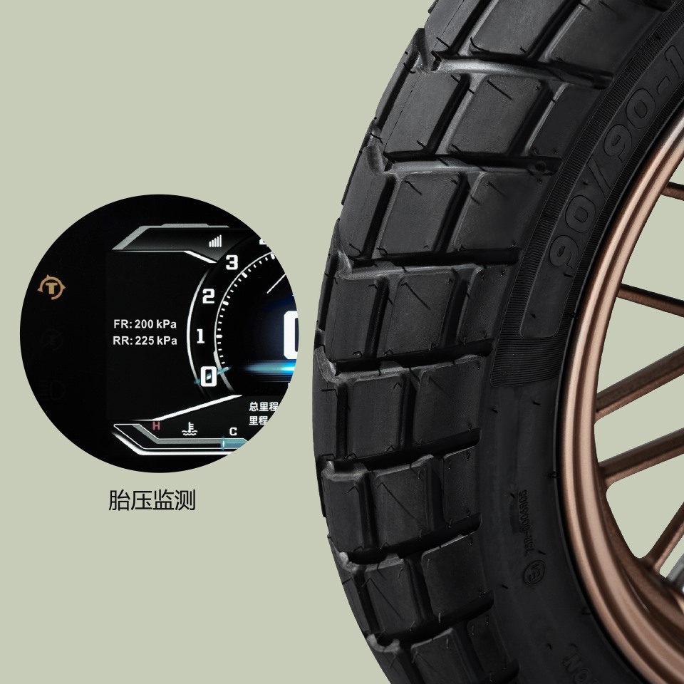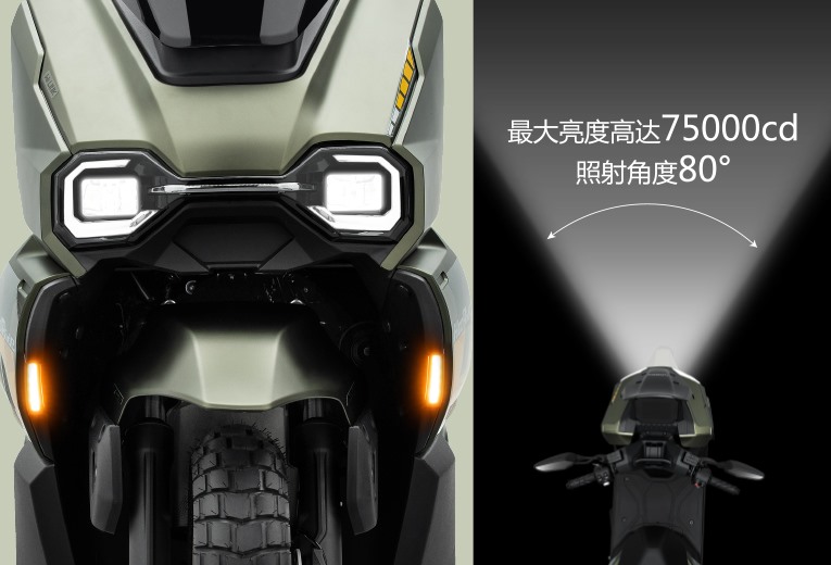 借鉴本田Africa Twin的设计元素,采用环形包围透镜大灯的设计;远光最大亮度高达75000cd,照射角度80°;同级别超高亮灯光,夜间骑车更安全