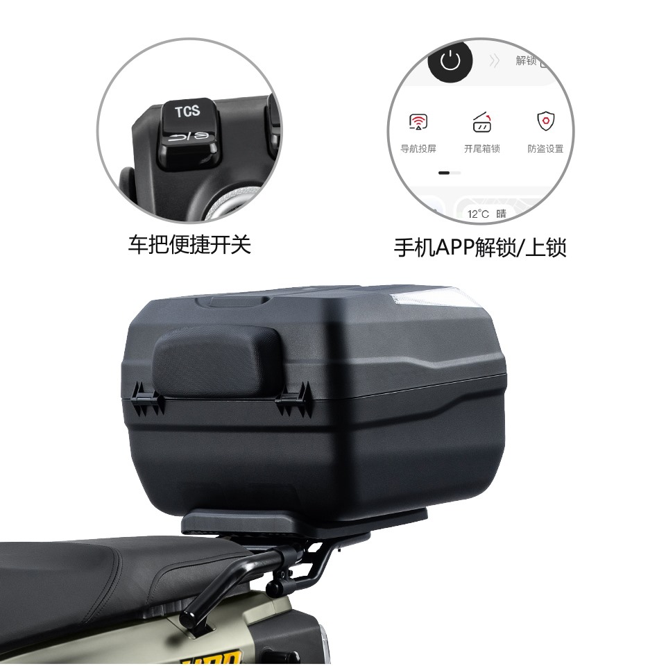 可通过车把上的便捷开关、手机APP一键操作进行解锁/上锁,真正实现尾箱使用的“无钥匙化”