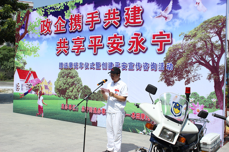 活动期间,我司与永宁街共同发出了“政企携手共建、共享平安永宁”的倡议,并捐赠了八辆摩托车用于当地周边治安巡逻以及便民服务,以体现企业公民的社会责任。